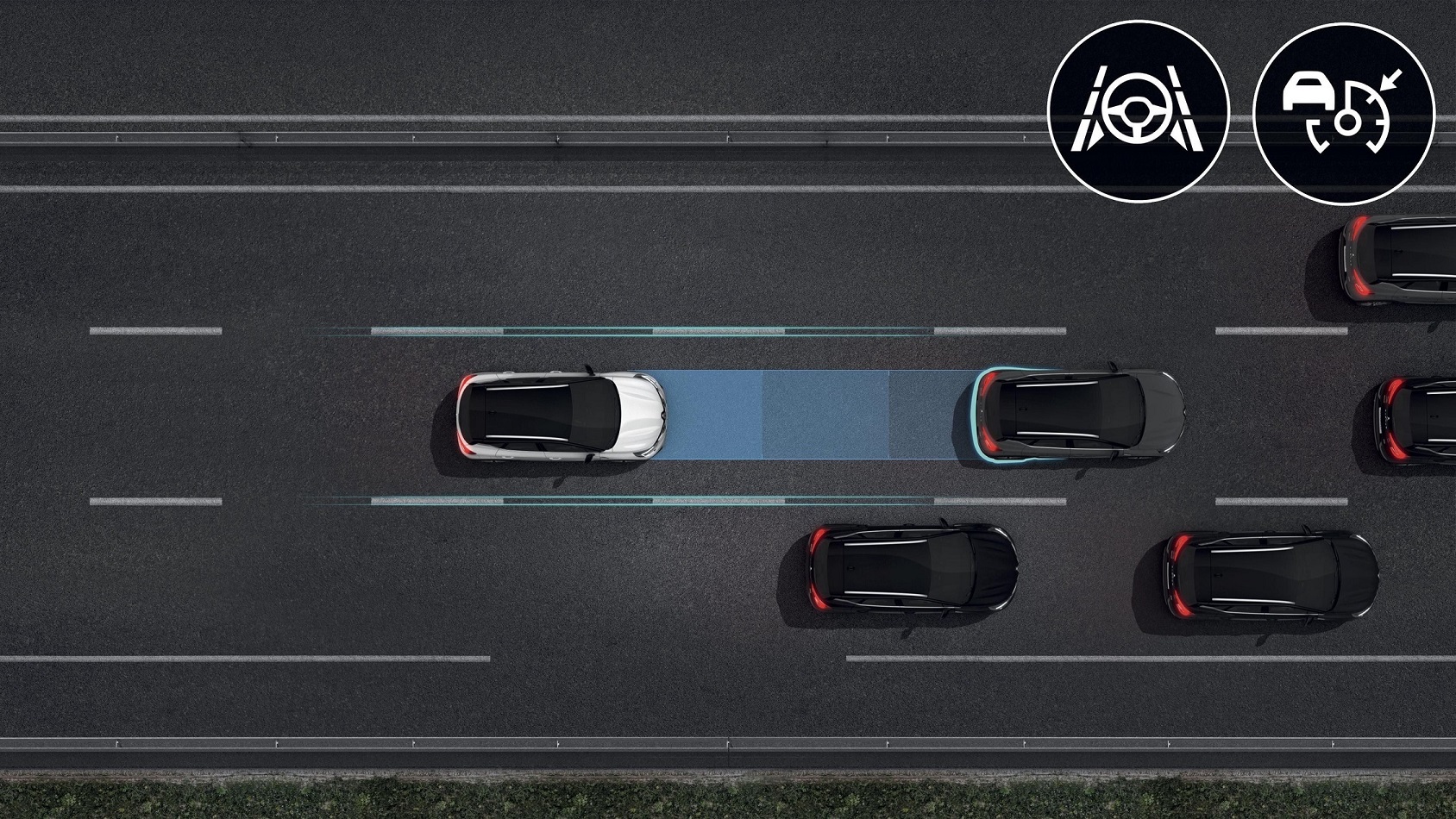 Noch mehr Komfort und Sicherheit insbesondere auf langen Strecken bietet der Verkehrs- und Autobahnassistent. Das radar- und kamerabasierte Assistenzsystem auf Level 2 (teilautomatisiertes Fahren) beinhaltet sämtliche Funktionen des adaptiven Tempomaten mit Stop & Go-Funktion und erweitert diese zusätzlich um die so genannte Querführung. Das heisst: Auf einer Autobahn oder einer mehrspurigen Strasse mit Fahrbahnmarkierungen können der Neue Clio und der Neue Captur komplett übernehmen, beschleunigen, bremsen und dem vorausfahrenden Fahrzeug folgen. Dies schliesst das selbstständige Lenken ein. Gleichzeitig sichern sie den korrekten Abstand zum vorausfahrenden Fahrzeug.